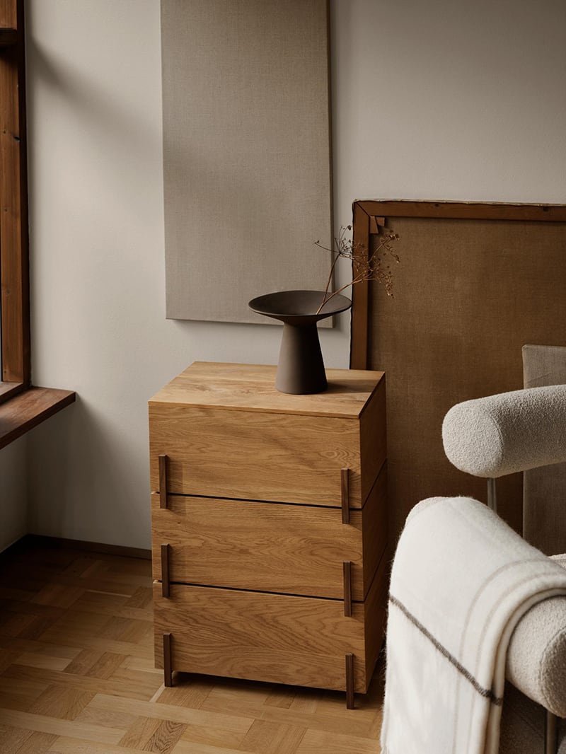 With its simple and sculptural design, the Collar Vase is a perfect example of Kristina Dam Studio’s philosophy of ‘Sculptural Minimalism’. Made from terracotta with a matt brown finish, it is glazed inside, making it waterproof and suitable for wild bouquets and single branches. The Collar Vase is available in two sizes, each with a distinctive shape.