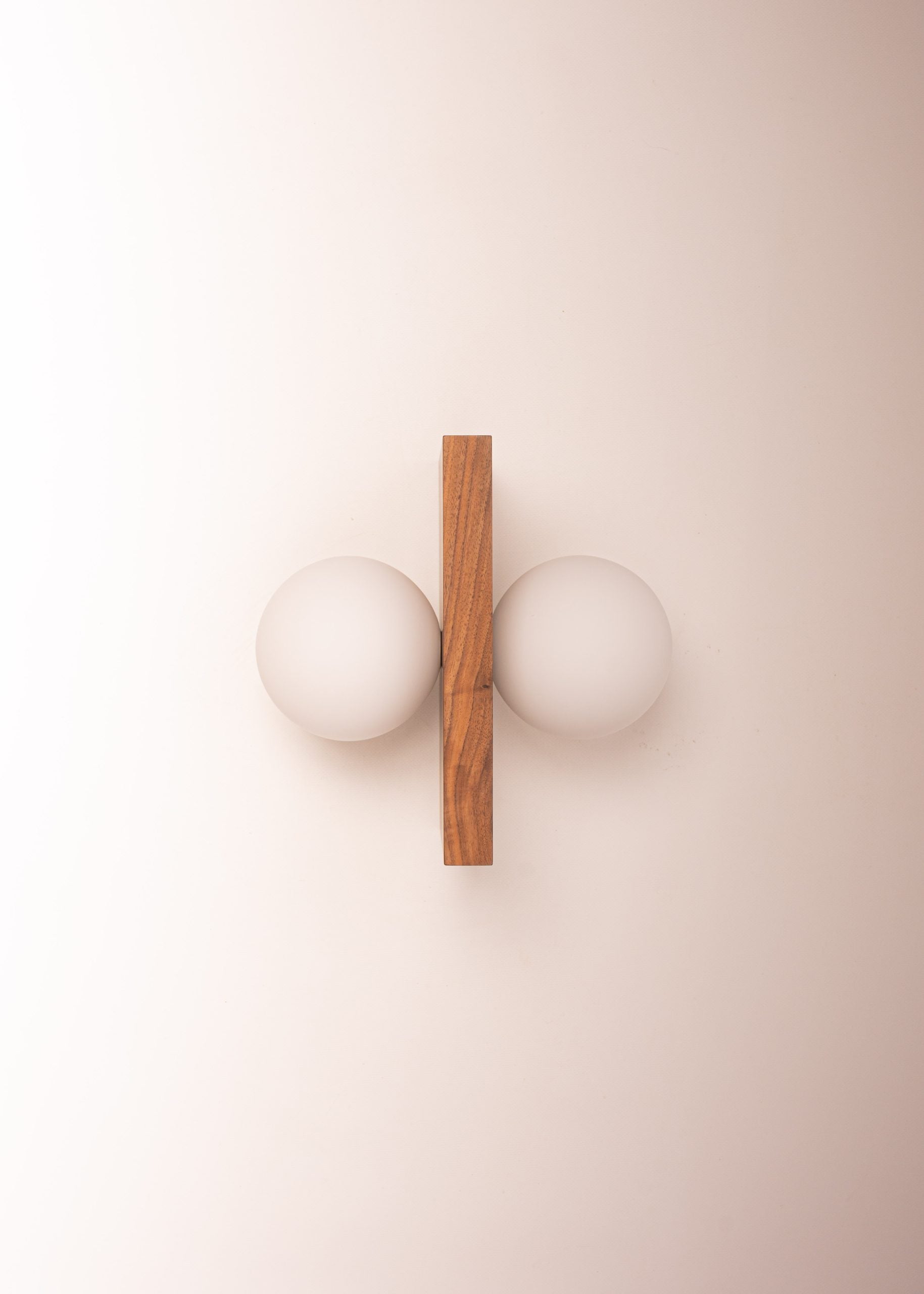 The Flugi Wall light is all about contrasts. The opposition of the sharp edges from the solid walnut piece with the soft edges of the glass globes, creating a bold and unique sconce.