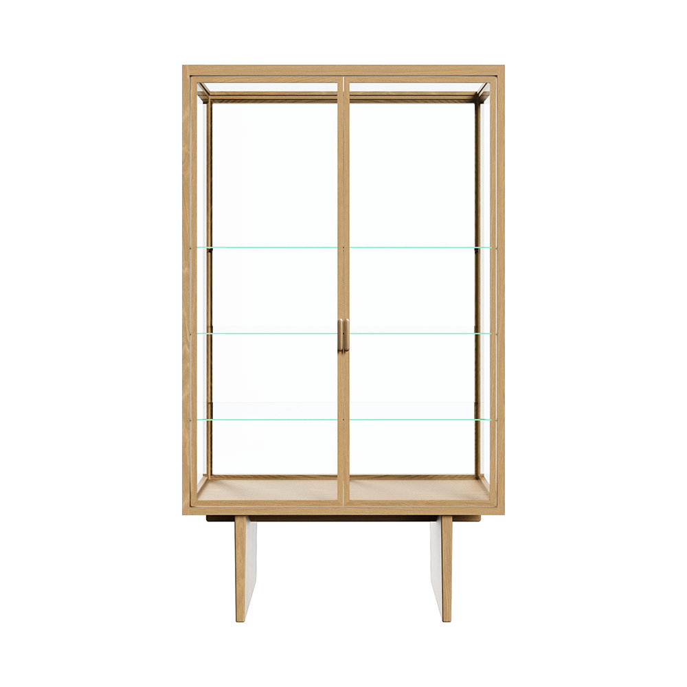 Inspired by antique Japanese furniture in both style and craft, this oak-veneered cabinet is elevated by two vertical legs, providing a lightness to its appearance and an understated elegance to its form. The frame secures a tall glass case, with three glass shelves, and two perfectly-aligned glass doors, completing the overall impression of lightness and transparency. Its very simplicity means the Private Vitrine can be used to store and display many types of possessions, from books to precious ornaments.