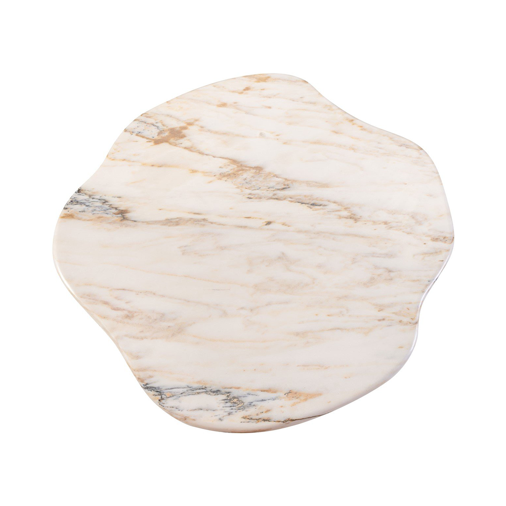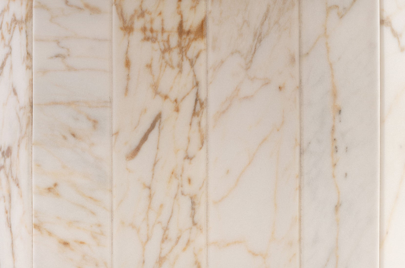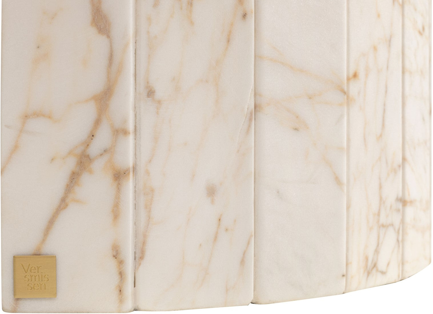 Introducing a sculptural centrepiece that merges majestic material with organic form — the Atol Coffee Table. Crafted in opulent Golden Calcutta marble, the tabletop presents gently irregular edges that reflect the stone’s natural beauty, while the twin semi-circular fluted bases provide a strong yet graceful foundation.