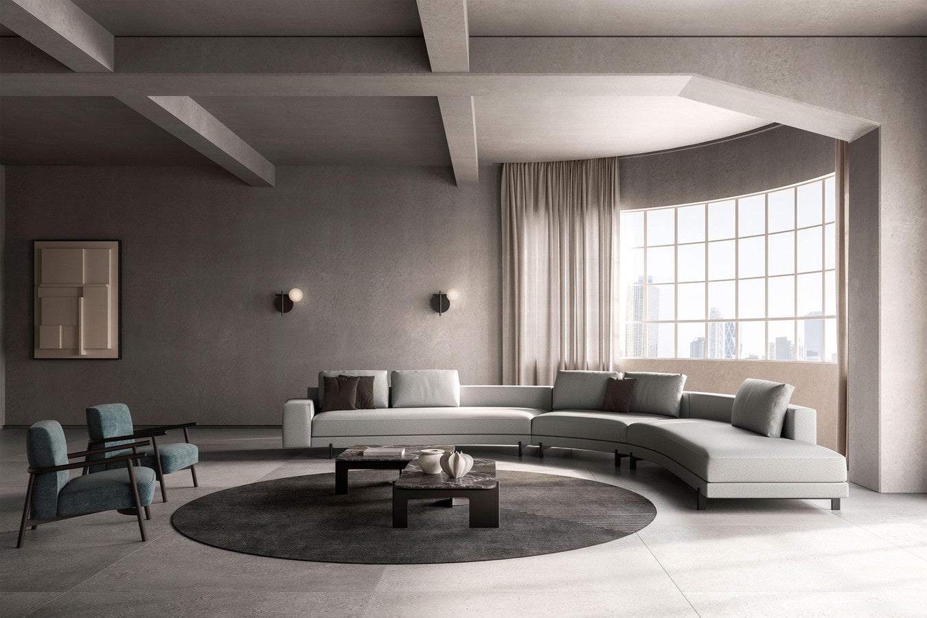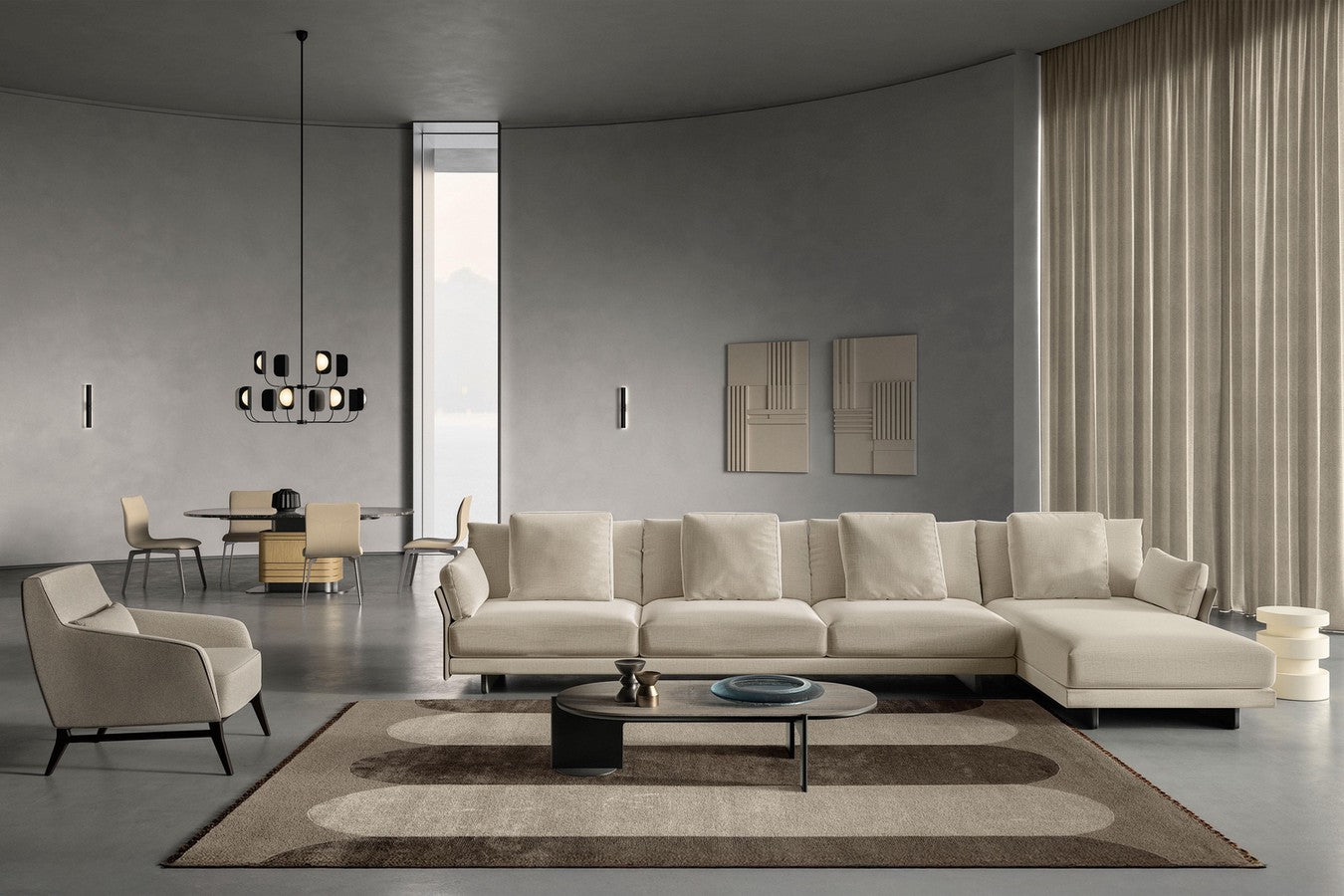 Modern and sculptural, the Mr President coffee table collection goes beyond the mere practical function, offering a series of statuary complements which become the protagonists in an elegant living room. To create an environment that is coordinated down to the smallest details, the sofa and console table of the same name complete a living room where shapes, volumes and finishes are united by a single common thread.