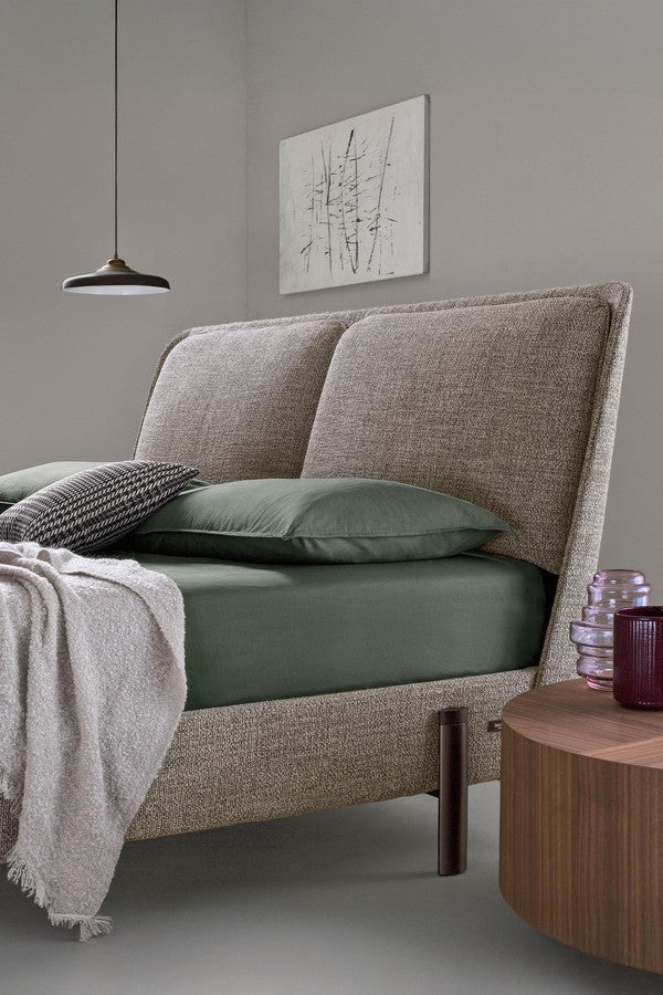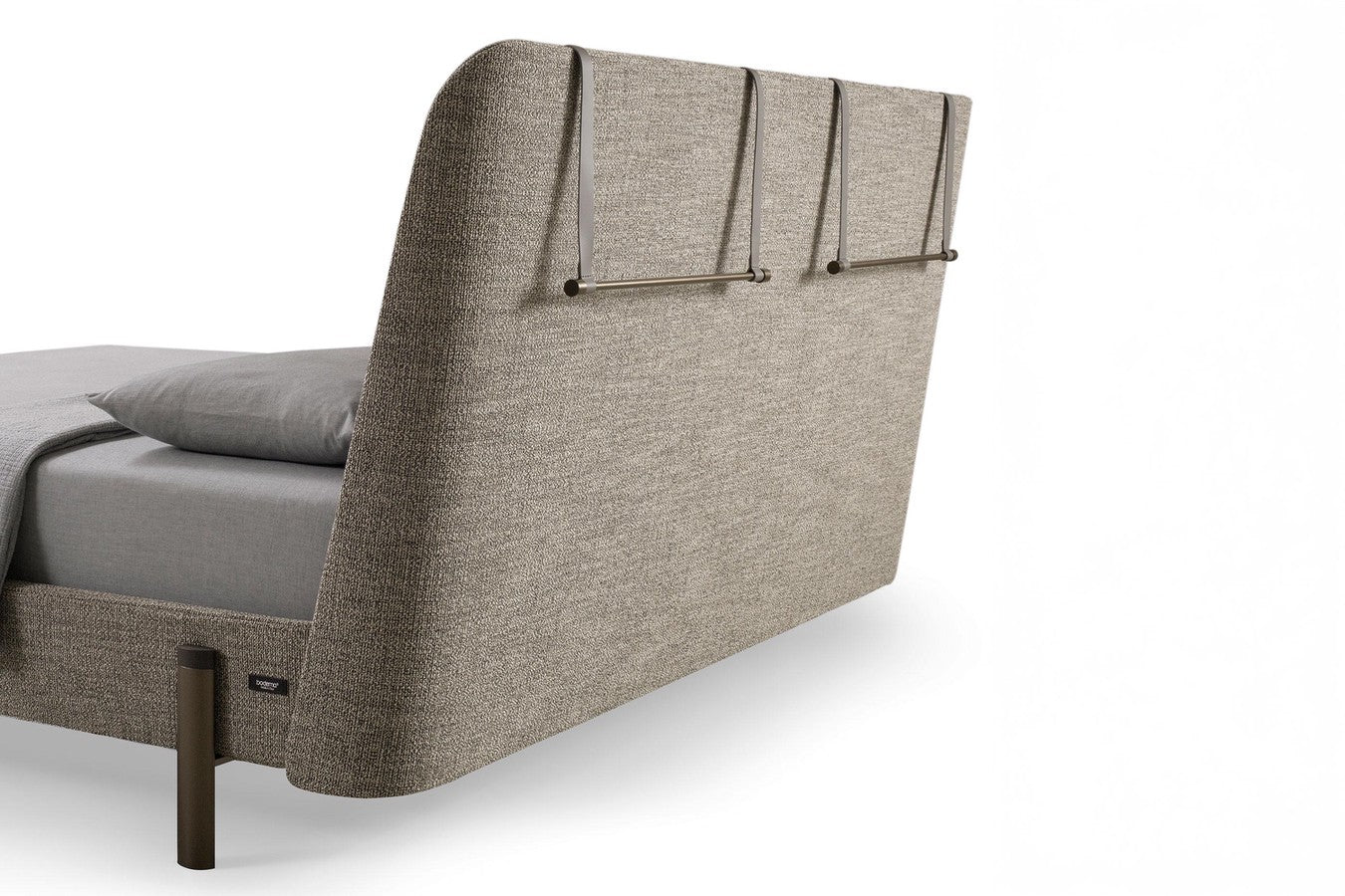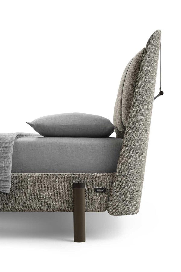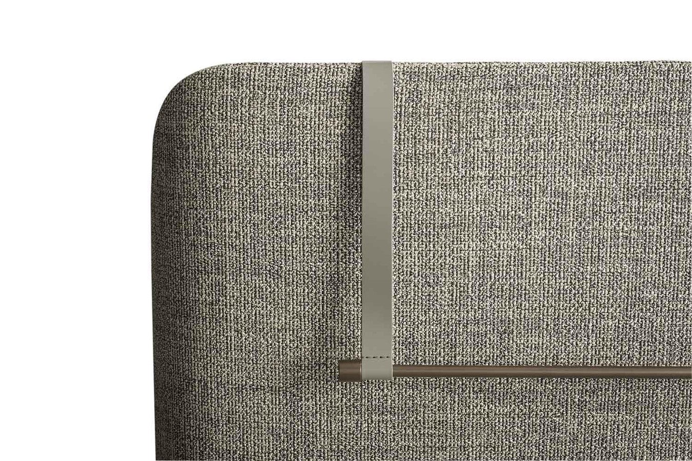 Uncomplicated lines make up the slanted headboard, which is designed to become the focal point in your room. The two cushions zipped directly to the bedhead will accommodate you as you read, watch tv, cuddle your children or talk in bed after a long, busy day. If you plan to position your bed in the middle of the room you can opt for a different design, with the cushions beautifully kept in place over the headboard thanks to leather laces connected to a weighted back bar. A luxurious addition that echoes saddlery, simple in its timeless elegance and effortlessly sophisticated.