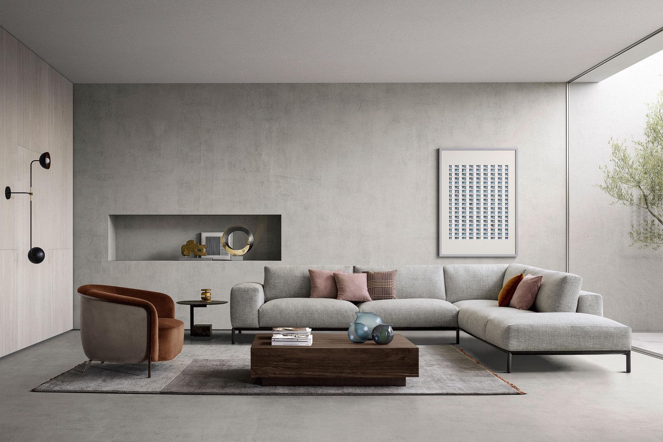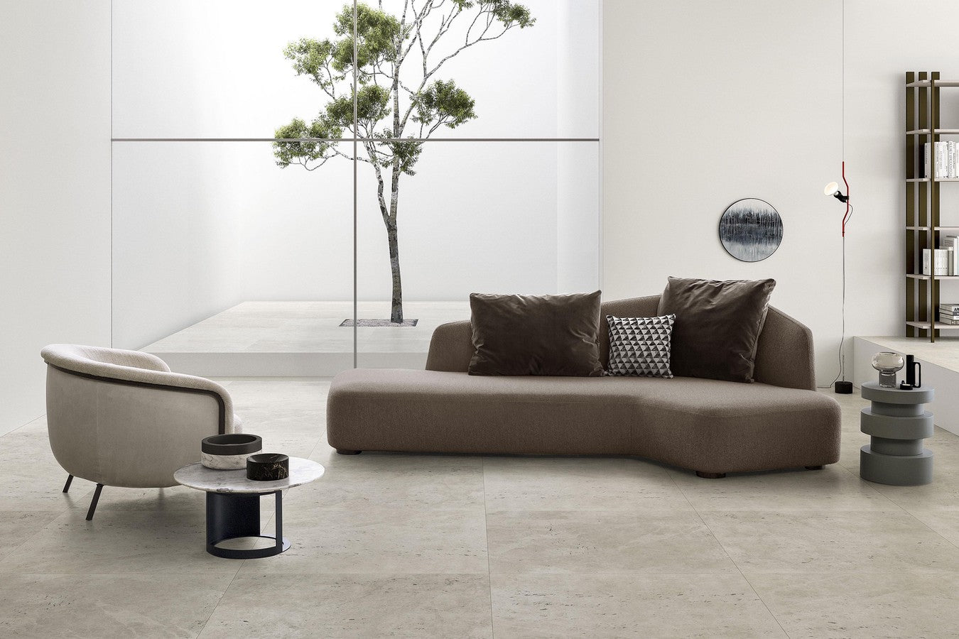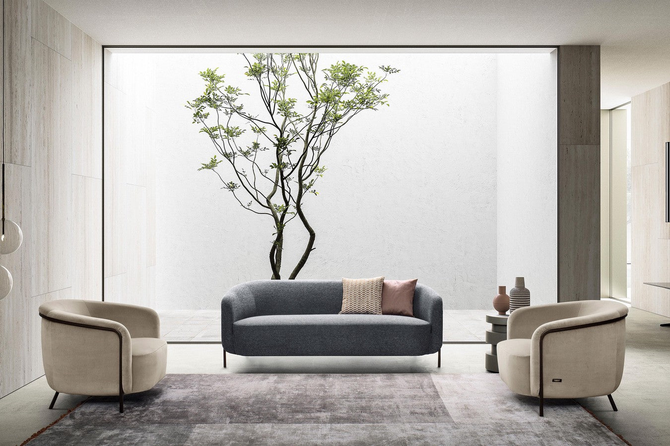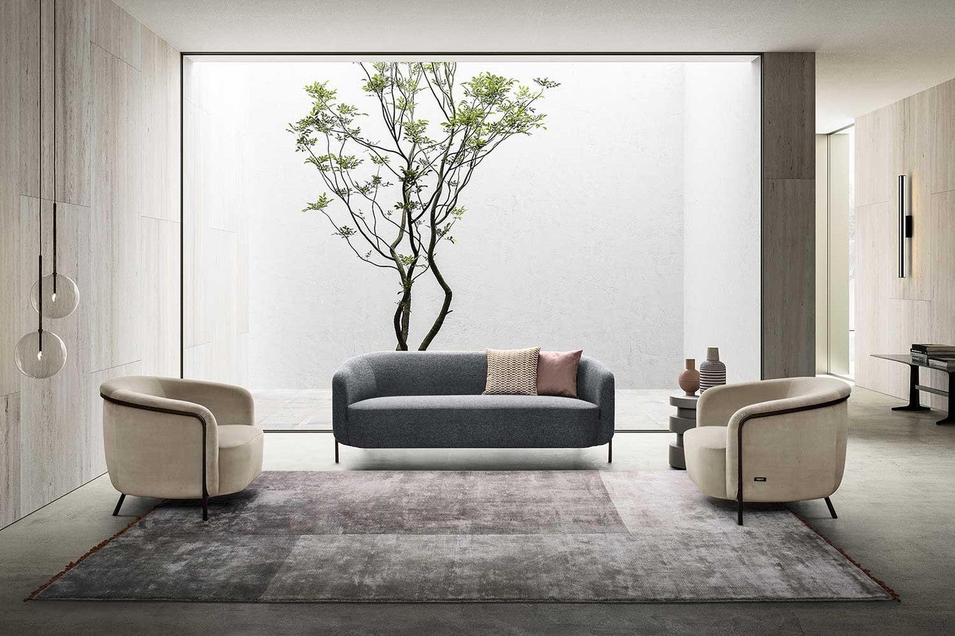 With its soft, rounded silhouette, the backrest and one-cushion seat offer a welcoming seat enclosed between two high arms. A contemporary twist is added to this statement chair through the sinuous metal frame that elongates towards the floor to become the armchair legs. A striking decorative and functional element that can be customized in a bronze or anthracite finish.